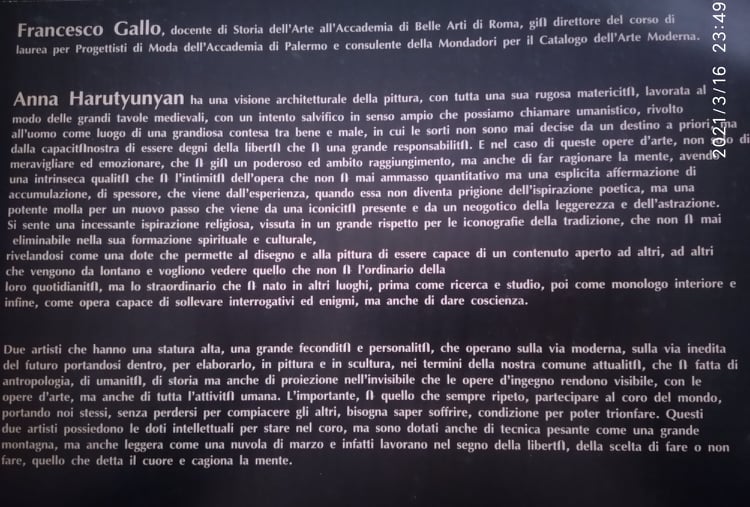 REFERENCESDialogos Giorgio Palumbi Pregiate interessanti opere pittoriche,quelle emotivamente create dall'Artista e presentate al mio sguardo,che si avvicendano verso un oltre profondamente sentito da proprio se' e che il suo personale calore interiore sa molto bene tradurre cromaticamente e segnica mente i propri sentimenti esistenziali,donando ad essi efficacemmente quel grande valore e quella preziosa descrittivita' che l'Artista ad essi nella vita attribuisce.Pittrice contemporaneadi elevato talento e coerente con il proprio pensiero metafisico,le cui scene di straordinaria simbolica costruzione sanno offrire ,creandone un meraviglioso dialogo con l'occhio dell'Osservatore,un invito al godimento delle energie che da esse prorompono donando gioia di esistere. Sentimenti e stupori che istintivamente e con sincera immensa spontanea capacita' realizzativa l'Artista rivolge, mediante vorticosi segni,alla passionalità' amorosa ed ai tumulti irrefrenabili dell'Eros intimamente vissuti:ricchezze del vitale proprio esistere. Ampi spazi telici,i suoi,ritmati dalla sfera del piacere ben sapendo che dove esso termina inizia la distruttrice freddarazionalita',cioe' quel mostro che inesorabilmente e' in perenne conflitto con la bellezza della vita. Giorgio Palumbi ANNA HARUTYUNYAN Strabiliane capacità innovativa del dipingere quella della Pittrice, che dimostra la personale esclusiva grande potenzialità costruttiva nel sapere eseguire vibranti capolavori espressivi, coltamente utilizzando la personale prestigiosa tavolozza cromatica, da Lei portata ai livelli più elevati dell’Arte e che la sospinge altresì ad elaborare intriganti retinati segni tesi al racchiudere i provati fragili e spirituali sentimenti in se abitati ed indesiderato brioso vivere le seduzioni dell’amore alla ricerca di una immaginata ed aspirata felicità. Eccellenti strutturazioni architettoniche, le sue, geometricamente districate, che sanno magicamente intrigare l’occhio dello spettatore che resta incantato dalle elaborate labirintiche espressioni pittoriche che sanno magicamente trasportare le spettatore in un “mondo altro” fatto di alternati bui e dorate luminosità nella consapevolezza del sapere bene e bel dipingere e di amorevole dedizione verso l’arte. Magistralmente impegno creativo quello di Anna Harutyunyan che trova forza e germinata fecondità da una profusa esemplare volontà di realizzare opere di grandi dimensioni desiderose di avvicinarsi quanto più possibile con i propri sentimenti ad una avvertita celestiale salvifica beatitudine riscaldata dal cuore che possa gratificare le asprezze delle proprie interiori patite inguaribile sofferenze alla ricerca di un superiore amore risanatore della propria anima. Eccellente maestoso dipingere, il suo, che sa commuovere bel farsi interminabile affascinante e coinvolgente narrazione delle proprie fragilità e del personale vitale coraggio che sa farsi prezioso racconto segnico e cromatico della propria fervente devozione verso l’arte, narrato attraverso un esclusivo pitture impreziosito di luci dal quale emerge la trionfale vitalità della sua colta gestualità artistica universalmente ammirata. I was
