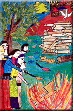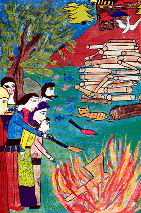 The peasants crowded around, and taking up thick sticks began to beat the axe. When they saw the axe was none the worse for the heavy beating they gave it, they piled wood on it and set fire to it. The flames rose high. When the fire had died, down, they approached, poked about in the ashes and discovered that the axe had turned red. "Alas!" they cried, "Brother Axe is angry. Look how red he has turned! He will bring some calamity upon us. What shall we do?" They thought and pondered, and finally decided to throw the axe into prison. So they took it and flung it into the landlord's barn. The barn was full of hay. As soon as the red-hot axe touched the hay, a fire broke out and great flames leapt up to the sky.Terrified, the villagers ran after its owner, overtook him and pleaded, |