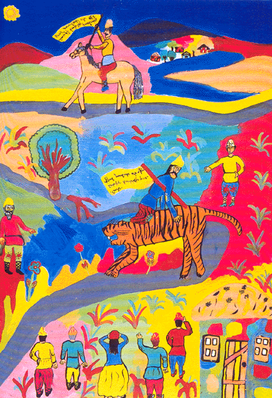 Nazar the Brave has tamed the tiger, and is riding it like a horse!" They