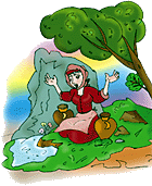 the second daughter began to wail. She sat down next to her sister, and began to weep. Meanwhile the mother became still more anxious. She sent out her third daughter. "You'd better go see what has happened to your sisters," she said. The youngest daughter went to the spring, and found her sisters sitting there weeping bit-terly. "What has happened?" she cried anxiously. "Don't you know?" answered her eldest sister.