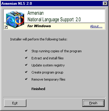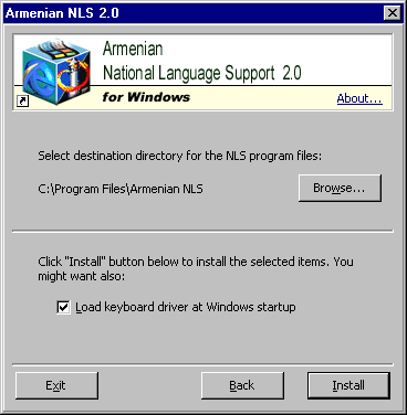 Armenian NLS is shipped as a single self-installing executable named "nls20.exe". To avoid viruses and trojan horses, it is strongly recommended to download the installer from the Armenian NLS master web site - http://www.freenet.am/armnls - or, otherwise, from a mirror site introduced on this page.
