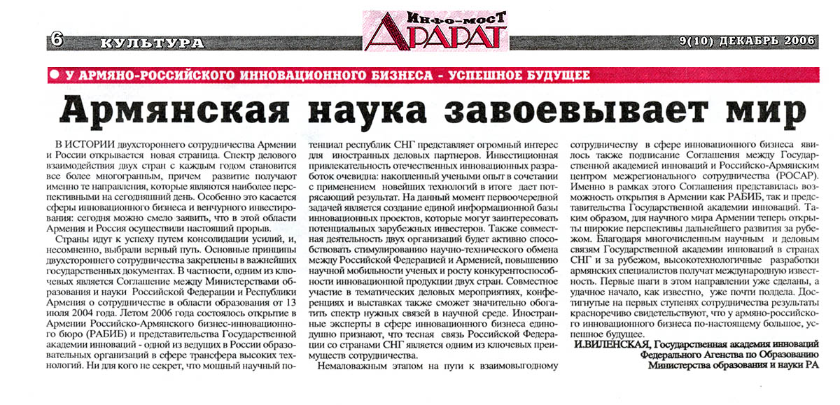 Армянская наука завоевывает мир. Инфо-мост Арарат, 09.12.2006г.