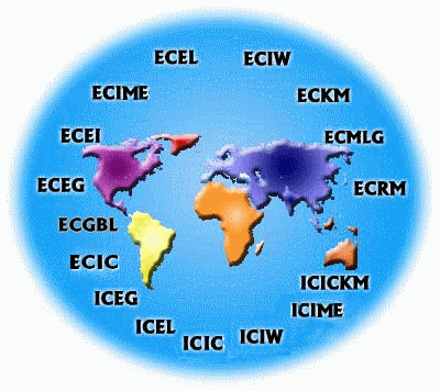ECRM: Next European Conference on Research Methods: 22-23 June 2009, Valetta, Malta ECEG: Next European Conference on e-Government: 29-30 June 2009, London, UK ECIW: Next European Conference on i-Warfare and Security: 6-7 July 2009, Guimaraes, Portugal ICEL: Next International Conference on e-Learning: 16-17 July 2009, Toronto, Canada ECKM: Next European Conference on Knowledge Management: 3-4 September 2009, Vincenza, Italy ECEI: Next European Conference on Entrepreneurship and Innovation: 10-11 September 2009, Antwerp, Belgium ECIME: Next European Conference on Information Management and Evaluation: 17-18 September 2009, Göteburg, Sweden |