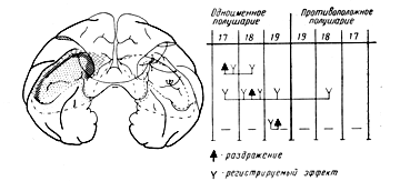 Рис. 5. Данные нейронографических опытов с раздражением первичных и вторичных отделов зрительной коры (по Мак-Кэллоку)