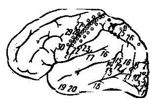 Рис. 6. Характер зрительный галлюцинаций, возникающих при раздрожении первичных и вторичных отделов зрительной коры (по Петцлю, Ферстеру, Пенфилду и др.). Характер галлюцинаций, вызываемых раздрожением соответствующих пунктов коры: 1 - светящиеся шары, 2 - окрашенный свет, 3 - белый свет, 4 - голубые диски к красным кольцом, 5 - пламя, надвигающееся со стороны, 6 - голубой туман, надвигающийся со стороны, 7 - лица, звери, идущие со стороны, 8 - друг, идущий со стороны и дающие знак, 9- лица, 10- звери, 11 - лица и бабочки, 12 - полет птиц, проходящий со стороны, 13 - желтый цвет, 14 - лица и животные вниз головой, 15 - человеческие фигуры, 16 - фигуры, 17 - шум, голоса, 18 - шум, 19, 20 - шум барабана, 21, 22 - вкусовые галлюцинации, 23 - ощущения движений в языке, 24, 25, 26 - вестибюлярные галлюцинации, 27, 28, 29 - насильственно издаваемые звуки, 30 - насильственное издавание слов |