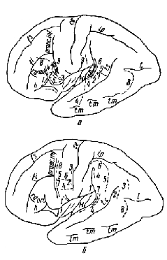 Рис 15. Связи вторичных отделов височной области с постцентральными и премоторными отделами коры (по. С. М. Блинкову). Синаптическая карта мест связей отдельных пучков волокон, входящих в состав дугообразного пучка. Одинаковыми цифрами на поверхности соответствующих участков мозга обозначены связи с корой каждого из прослеженных пучков волокон: а - связи между височной и нижней лобной извилиной; б- связи между височной долей и передней центральной извилиной |