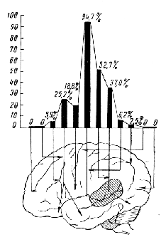 Рис 16. Нарушение фонематического слуха при поражении левой височной области (схема состав лена на основании исследования 800 случаев) (по А. Р. Лурия)