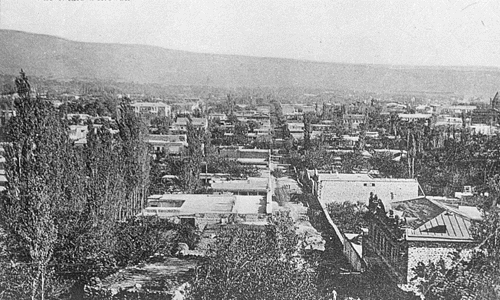 Общий вид центральной части города. Фотография начала 20 века Селитебный Новый район (Нор-таг), простирающийся от подножия Конда в направлении к Астафьевской улице (Абовяна): видна Бебутовская улица (Павстоса Бузанда), слева от нее между садами пролегает Царская (Арама), справа - Назаровская (Амиряна). С этой стороны вырисовывается силуэт церкви Сурб Григор Лусаворич (на месте школы имени Чаренца). Перед ней, параллельно передней границе изображения, тянется Каравансарайская (Езника Когбаци), проходя в левой части мимо возвышающегося над застройкой трехэтажного с двухъярусными балконами дома О.Татевосяна на углу с Царской (ул.Арама,52). Панорама отчетливо демонстрирует характер строения городских усадеб: правильные формы земельных отведений, регулярное расположение на красной линии улицы главных объемов, внутренние дворы, вокруг которых сосредоточены флигеля с остальными жилыми и многочисленными подсобными помещениями. Обильная зелень садов переливается между имениями, образуя покрывающий всю территорию единый зеленый массив. "Эривань - город садов",- пишет Х.Ф.Б.Линч. Основная часть кварталов снесена в связи с прокладкой Главного проспекта.
