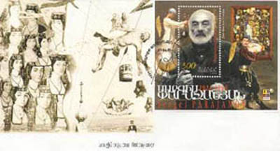 colour film and collage To the memory of Faberge MS 11A. On the stamp - the portrait of Sergei Parajanov. On margins - a fragment of The pomegranate's colour film and collage To the memory of Faberge and logo of IBRA'99 Philatelic Exhibition