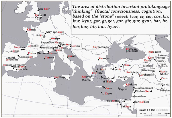 7. Языковая картина мира, полученная на основе “каменных” архетипов названий гор, рек, озер, населенных пунктов, городов с корнями “кр, кар, кер, кир, кор” и т. д.