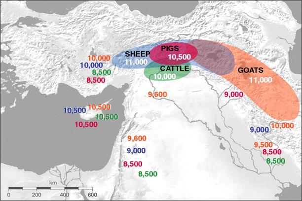 Затененные области - общие регионы и примерные даты (в годах до н.э.) начального одомашивания. Даты вне заштрихованных областей показывают приблизительное время, когда впервые появляются одомашненные животные в регионе. Оранжевым цветом выделено расселение коз, синим – овец, зеленым – крупный рогатый скот, красным – свиней. Источник: Domestication and early agriculture in the Mediterranean Basin: Origins, diffusion, and impact. Melinda A. Zeder, Archaeobiology Program, National Museum of Natural History, Smithsonian Institution, Washington,. Edited by Jeremy A. Sabloff, University of Pennsylvania Museum of Archaeology and Anthropology, Philadelphia, May 27, 2008. Proceedings of the National Academy of Science of the US of America.