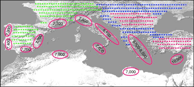 Расположение анклавов хозяйств показано красным цветом в виде эллипсов. Примерные сроки формирования анклавов приведены внутри эллипсов (в годах до н.э.). Красные точки представляют собой области, которые были колонизированы фермерами (земледельцами); зеленые точки указывают районы, где доминировали местные, коренные хозяйства, а синие точки – области, где, вероятно, произошла интеграция культур колонистов - фермеров с местными, коренными группами. Источник: Domestication and early agriculture in the Mediterranean Basin: Origins, diffusion, and impact. Melinda A. Zeder, Archaeobiology Program, National Museum of Natural History, Smithsonian Institution, Washington. Edited by Jeremy A. Sabloff, University of Pennsylvania Museum of Archaeology and Anthropology, Philadelphia, PA, May 27, 2008. Proceedings of the National Academy of Science of the US of America).